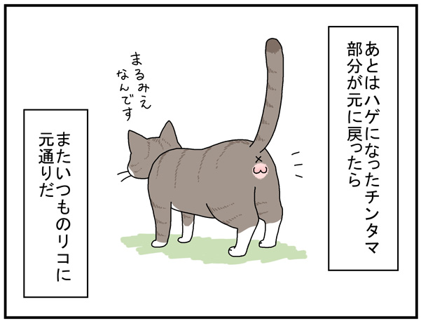 さすがにハゲだけはすぐ治らないので、毛が生え揃うまで痛々しいチンタマ丸出しです。