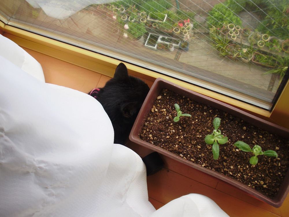 窓際で陽の光が入るからなのか、クロはヒマワリの横に