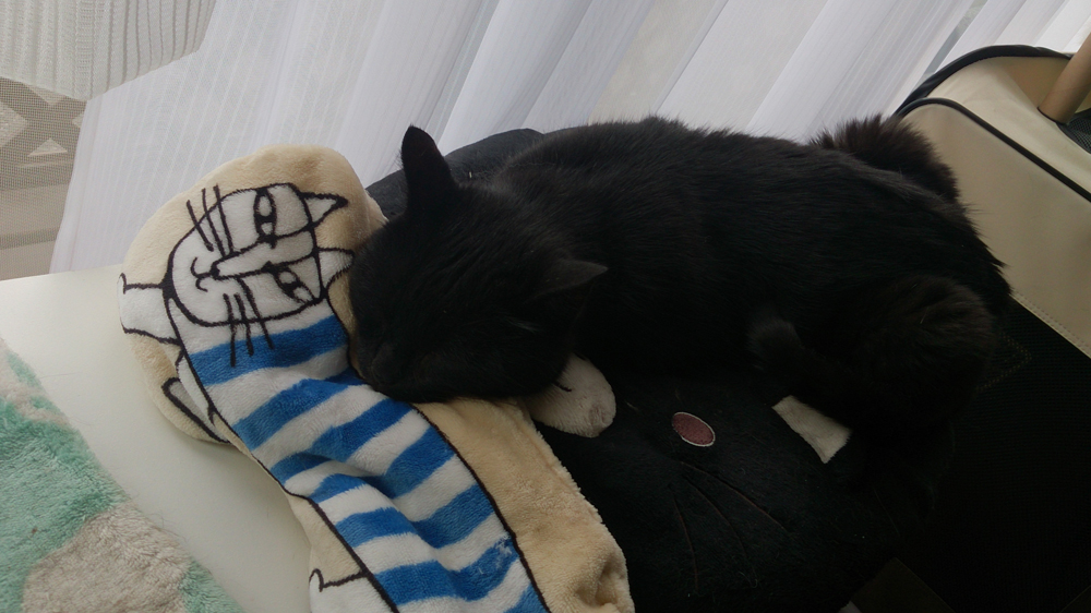 アペがトンネルで遊んでいる間、クロはスヤスヤ。
