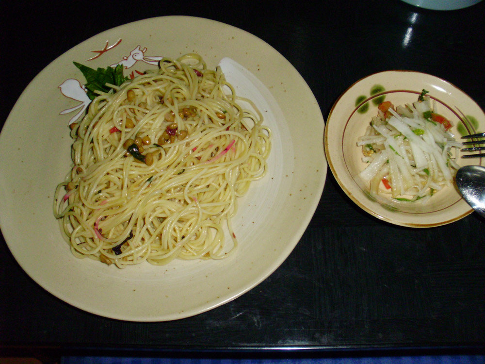 納豆と梅干とシソのパスタ、大根サラダです。