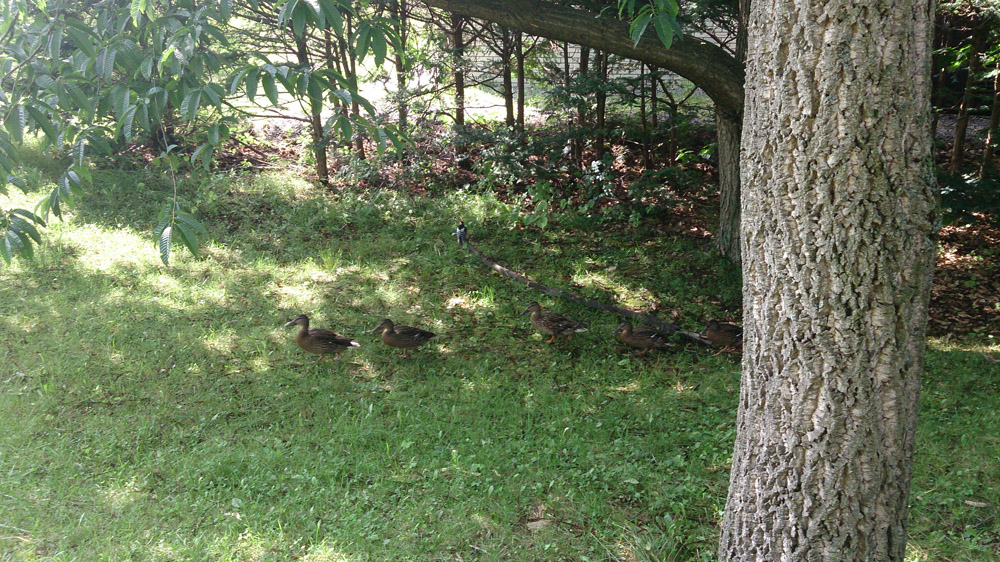 そのアカゲラの背後をてくてくあるくカモの行列。