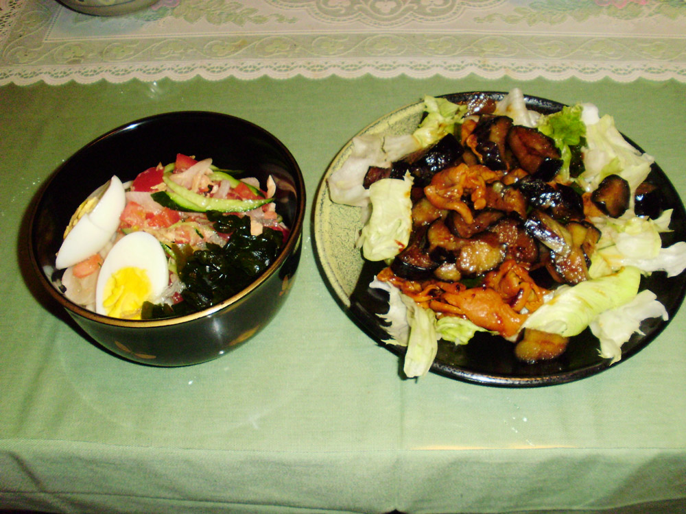 サラダうどん、モツ肉炒めと揚げ茄子を焼肉のタレで和えて炒めたもの。