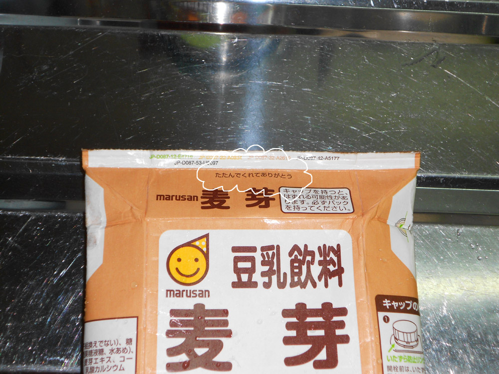 豆乳の箱をたたんだら、「たたんでくれてありがとう」だって。