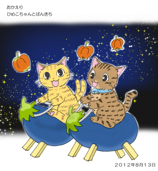 ある猫ブログさんのところで精霊馬に乗って帰って来ている