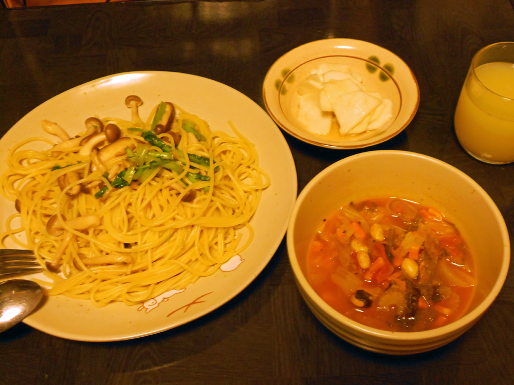 キノコとカブの葉の和風スパゲティ、ミネストローネ、カブのサラダ。