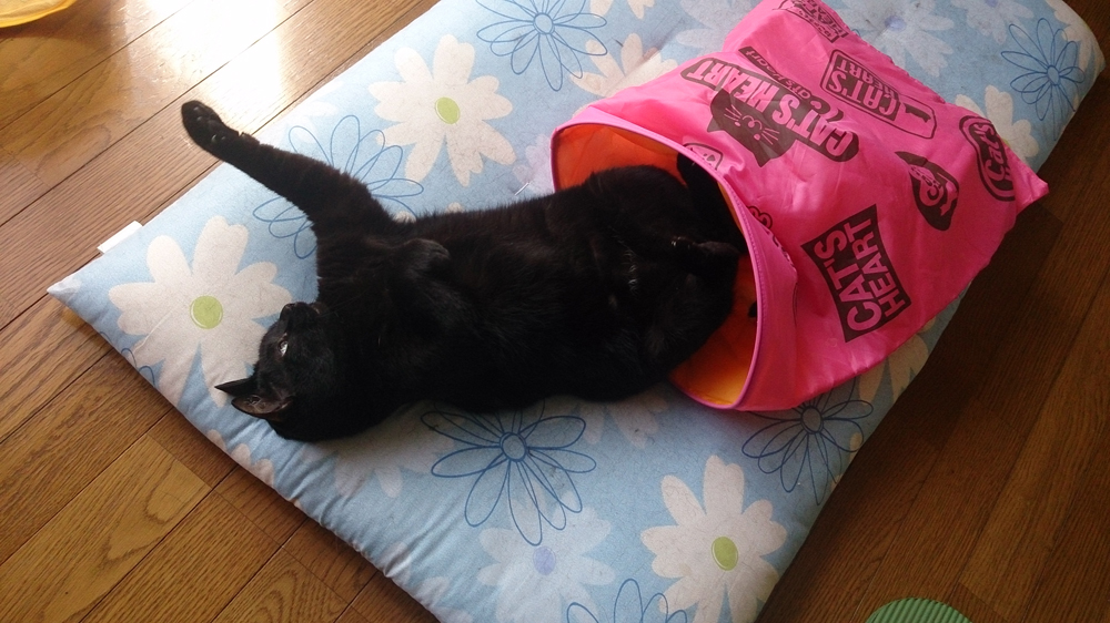 そんな暑い中、アペはねこのきもち付録の中に入って遊んでます。