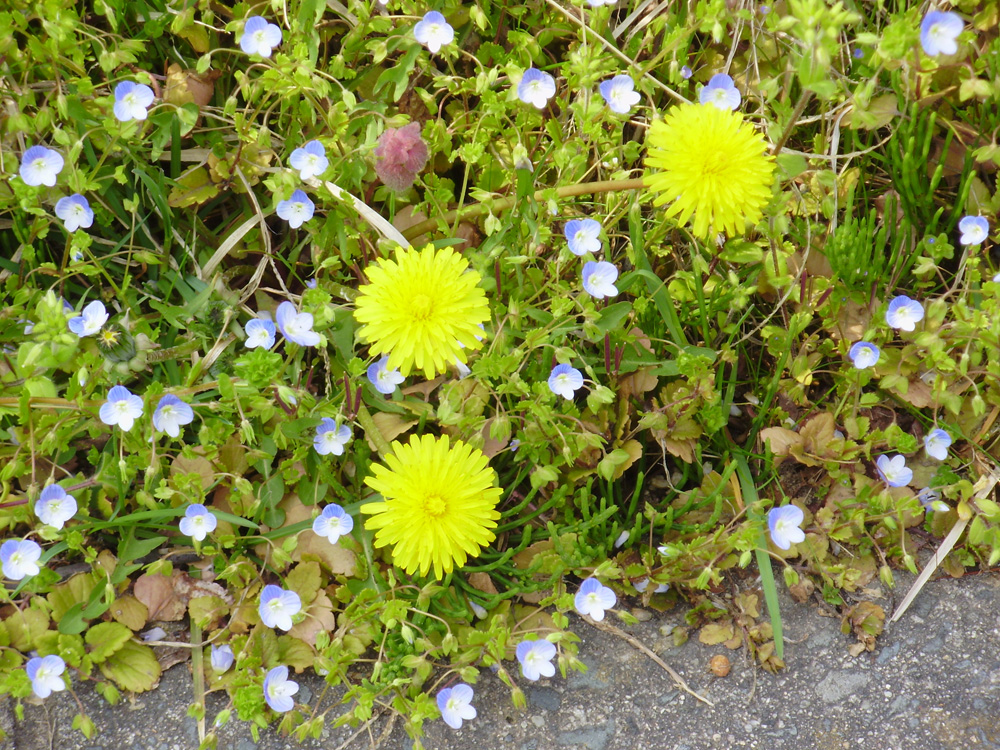 タンポポの周りを水色の小さい花がいっぱいで可愛らしい。