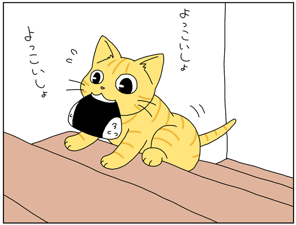 自分の頭ほどあるおにぎりをくわえて階段登って盗んだようでした。