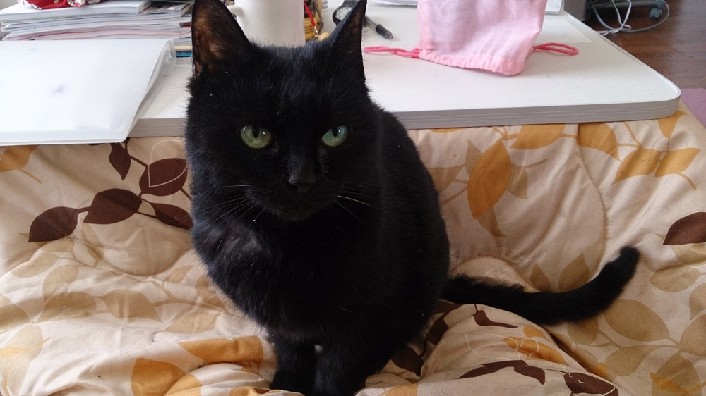 コタツに入ってる自分の腹の上でオヤツをねだるクロ。