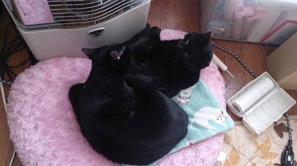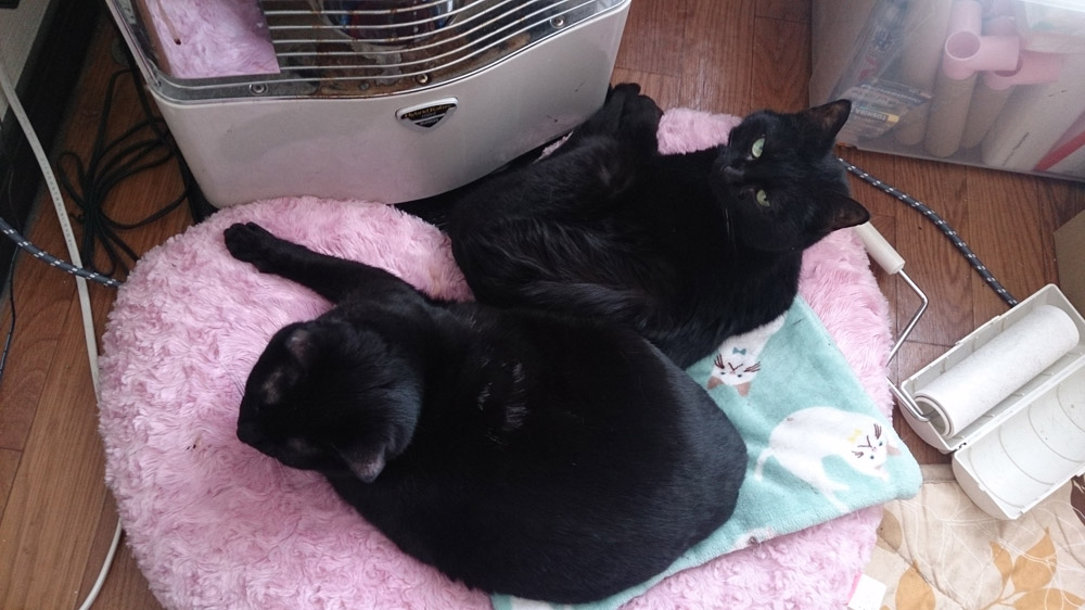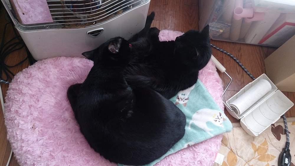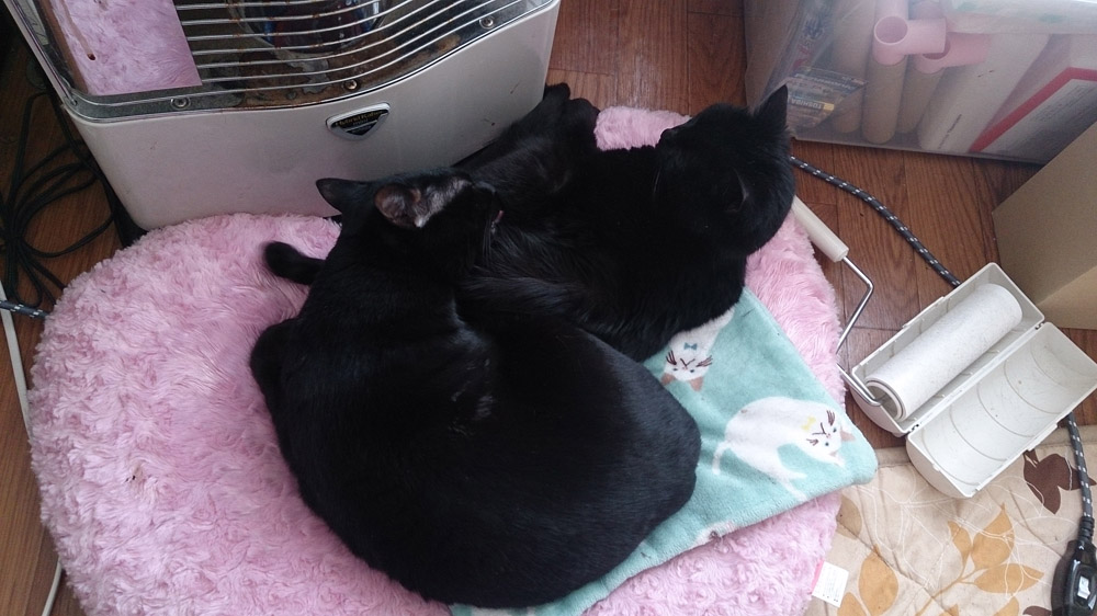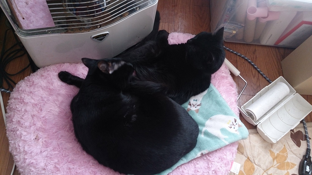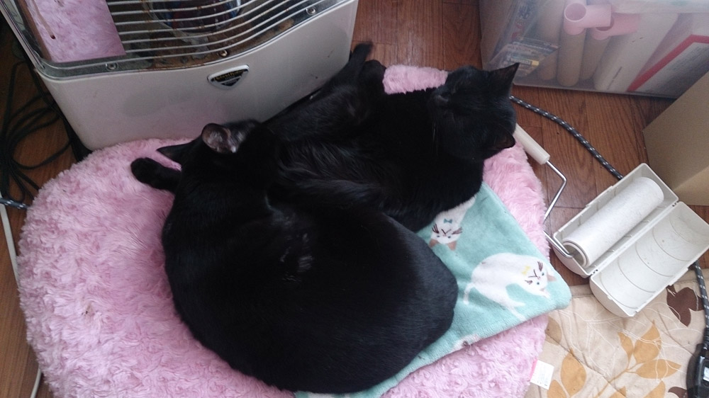 ストーブ前でくっついて寝てるクロとアペ。